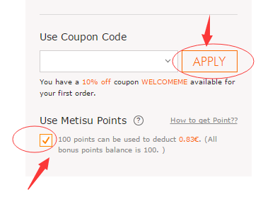You can apply coupons and check bonus points to your order at checkout. Once you’ve entered your coupon code, click “apply” and the discount will automatically adjust your order total.