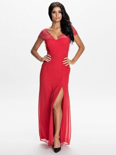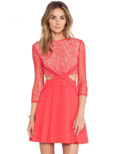 Red Twist Cut Waist Lace Contrast Skater Dress