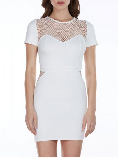 White Sleeveless Round Neck See-through Mesh Stripe Lace Dress