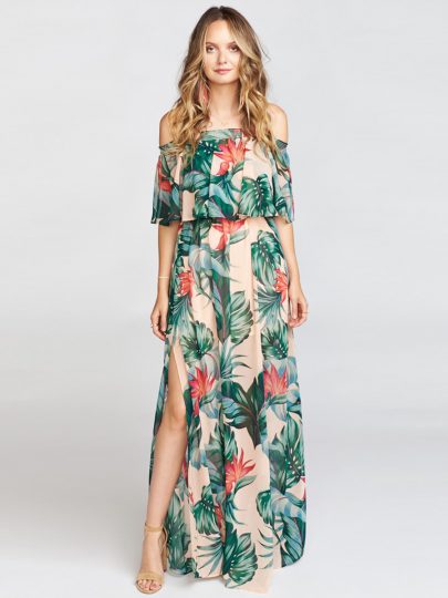 Red Cold Shoulder Ruffle Slit Maxi Dress
