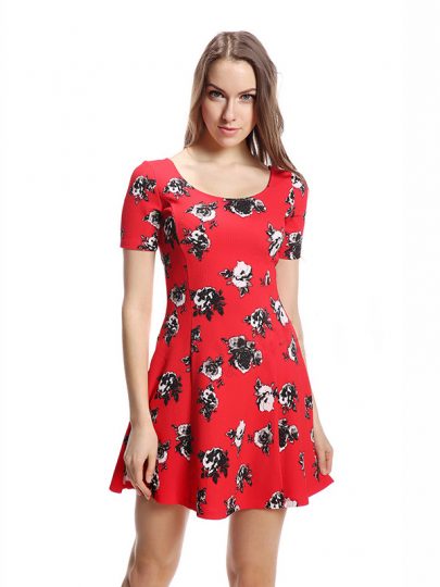 Red Twist Cut Waist Lace Contrast Skater Dress