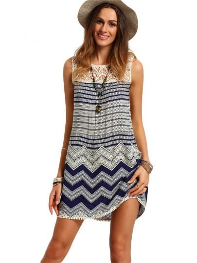 Multicolour Geo-tribal Print Lace Sleeveless Shift Dress