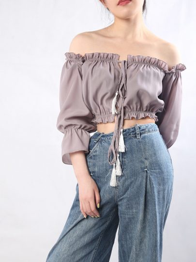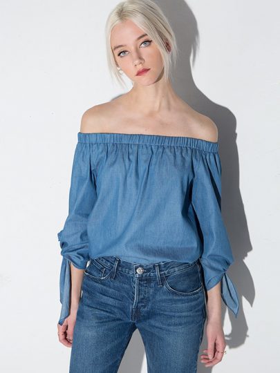 Blue Retro Off Shoulder Tie Sleeve Denim Blouse