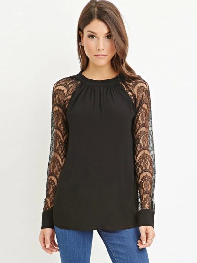 Black Lace Contrast Cut Out Back Blouse