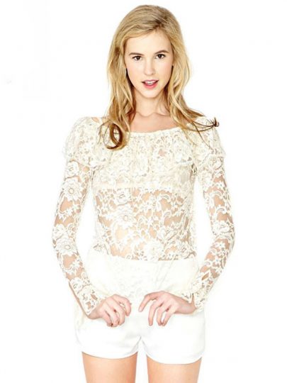 Off-the- shoulder neckline pleated lace shirt