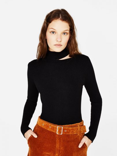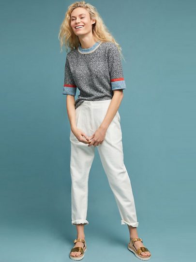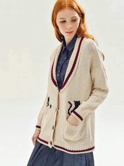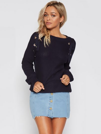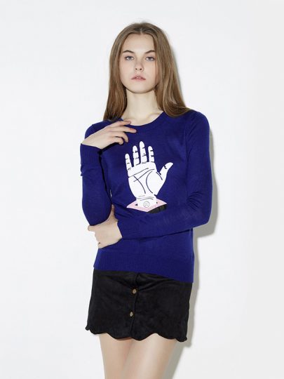 Bright Blue Palm Pattren Rib Cuff & Hem Sweater