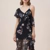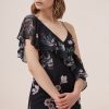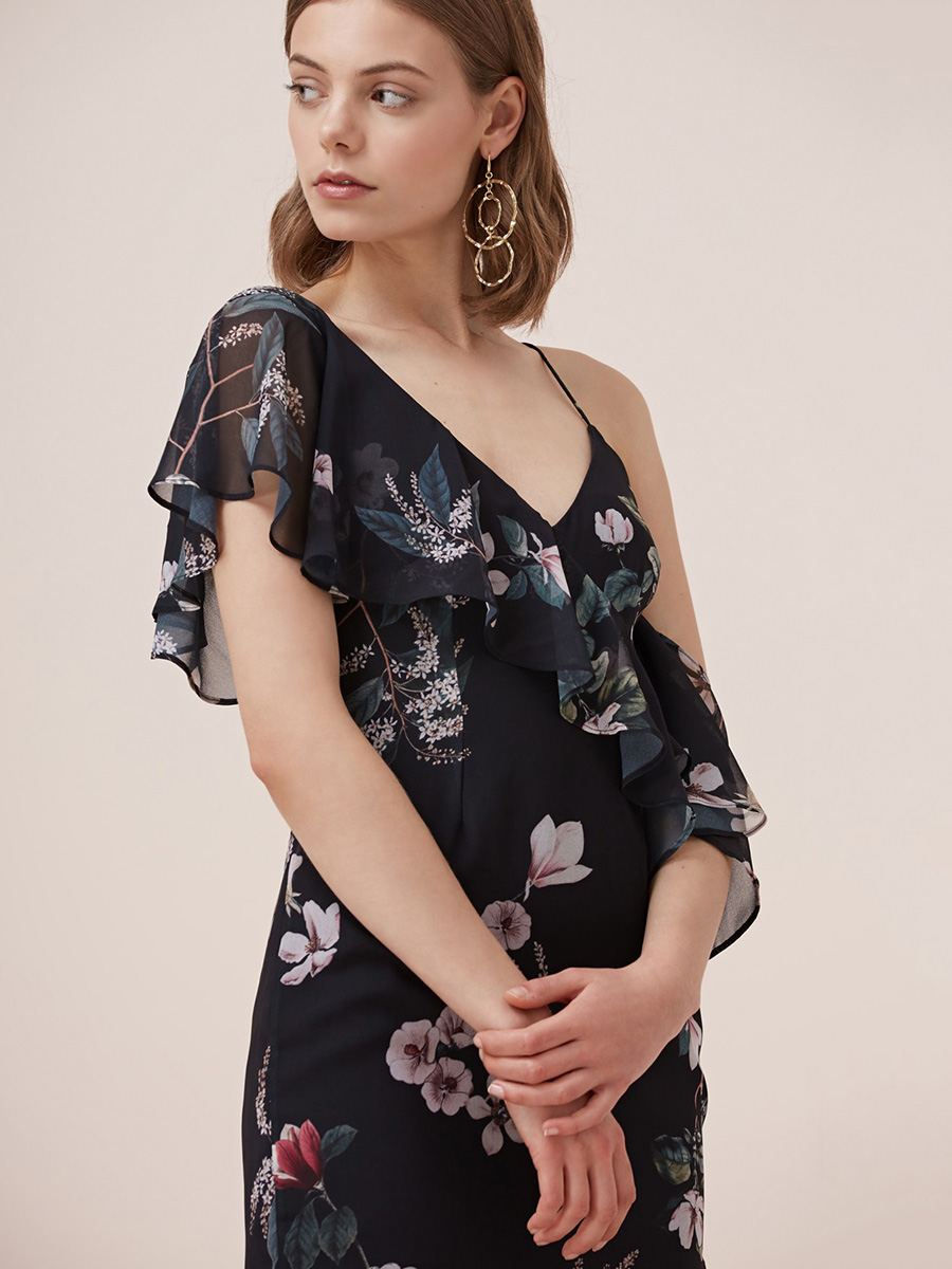Sexy asymmetric strapless ruffled print dress