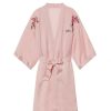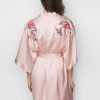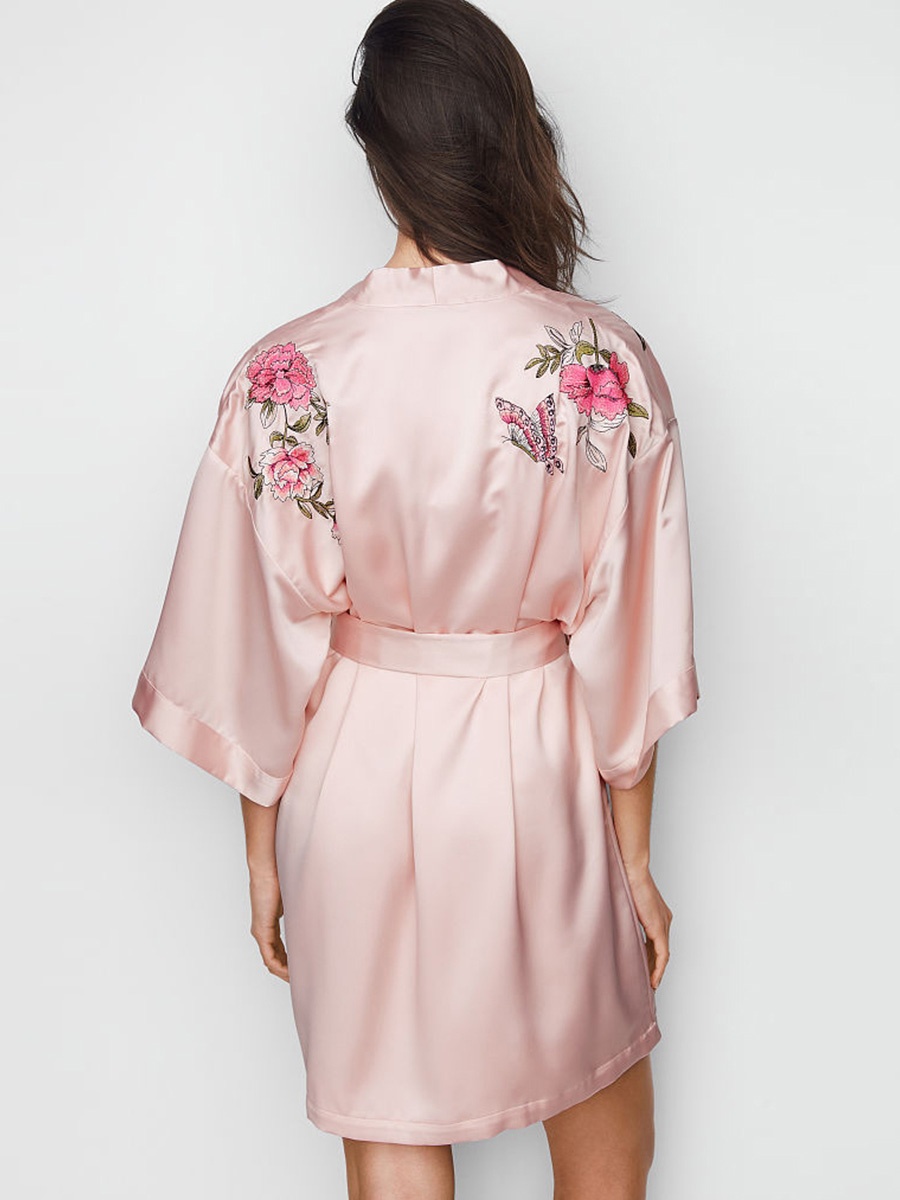 Simple sweet satin flower embroidery lace-up kimono robe